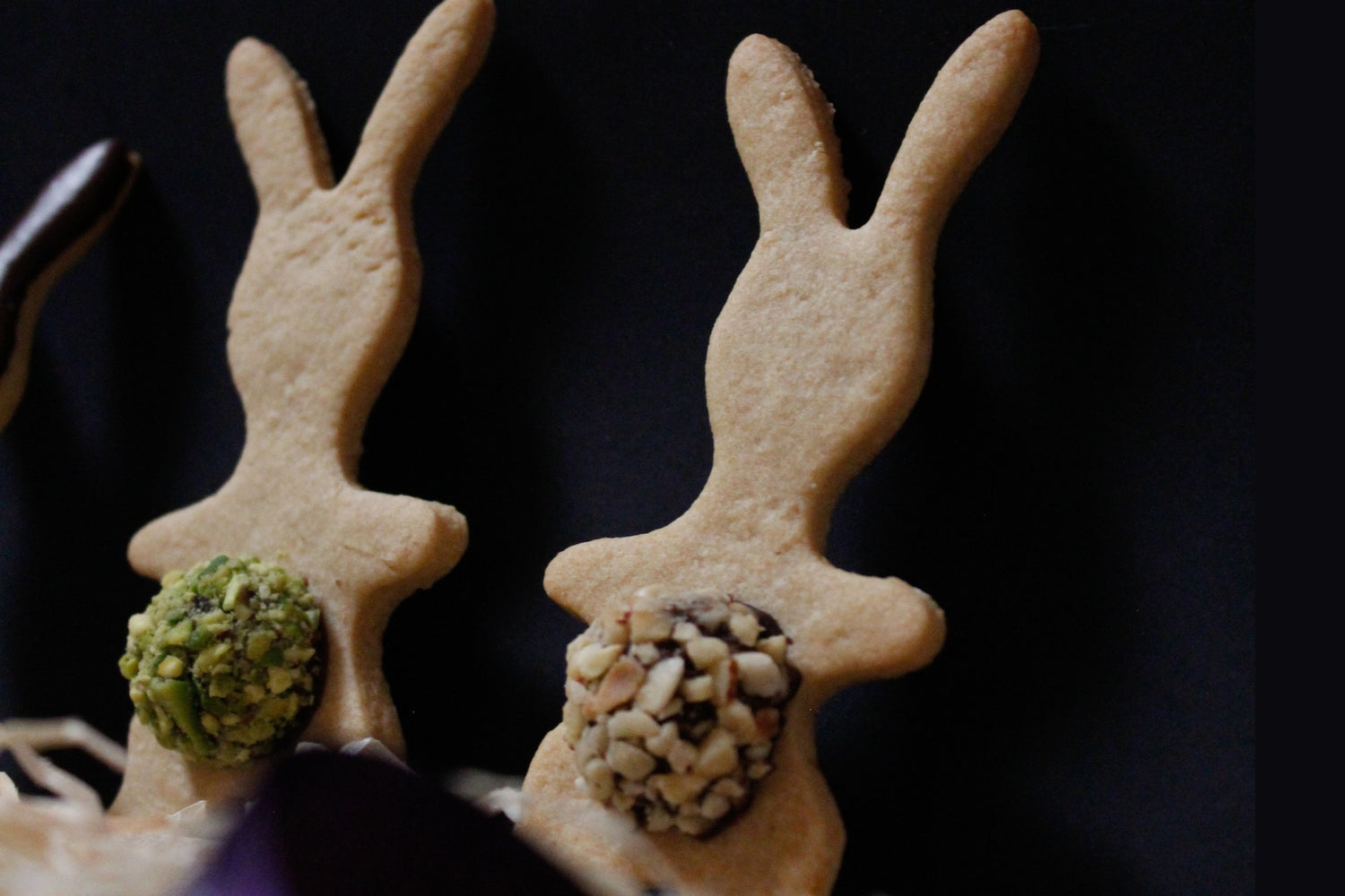 6. Dekorieren: Nach Belieben die abgekühlten Plätzchen mit geschmolzener odilia Dattelschokolade verzieren und das Dattelschokokonfekt als „Blume“ auf die Häschen setzen.