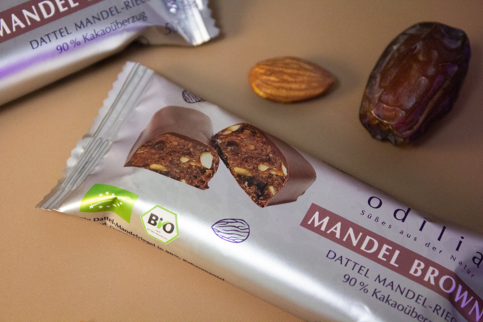 Mandel Brownie Bio Dattel-Mandelriegel im 90 % Kakaomantel