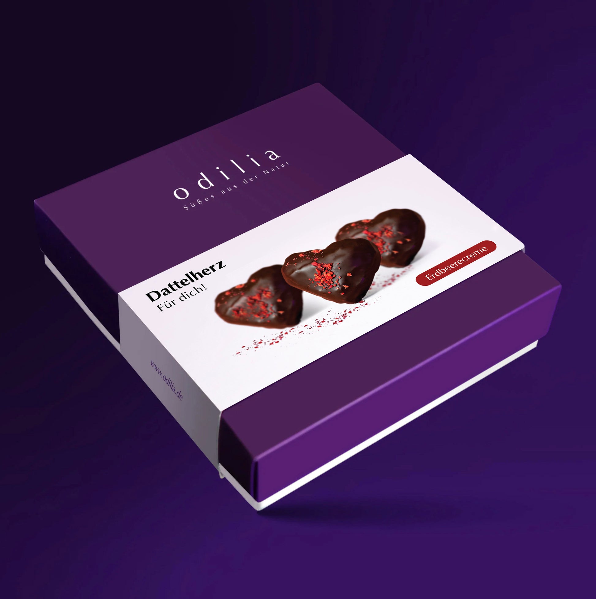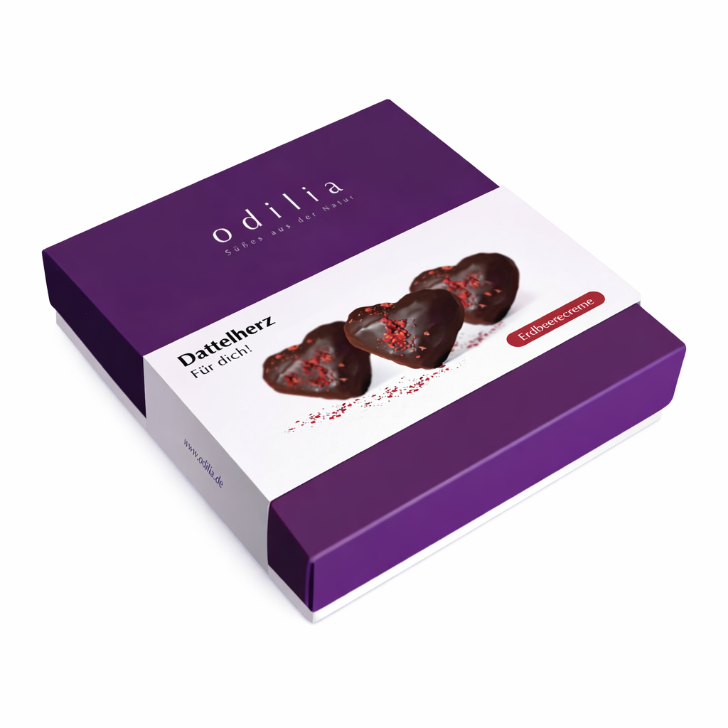 Für unser Dattelherz verwenden wir Bio Medjool-Datteln aus Jordanien, die für ihre Saftigkeit, natürliche Süße und hohe Qualität bekannt sind. Gefüllt mit einer fein-fruchtigen Erdbeercreme und umhüllt von edler, herb-aromatischer odilia Bio-Dunkelschokolade entsteht eine ausgewogene Komposition aus Fruchtigkeit, Tiefe und natürlicher Süße – ganz ohne zugesetzten Zucker.