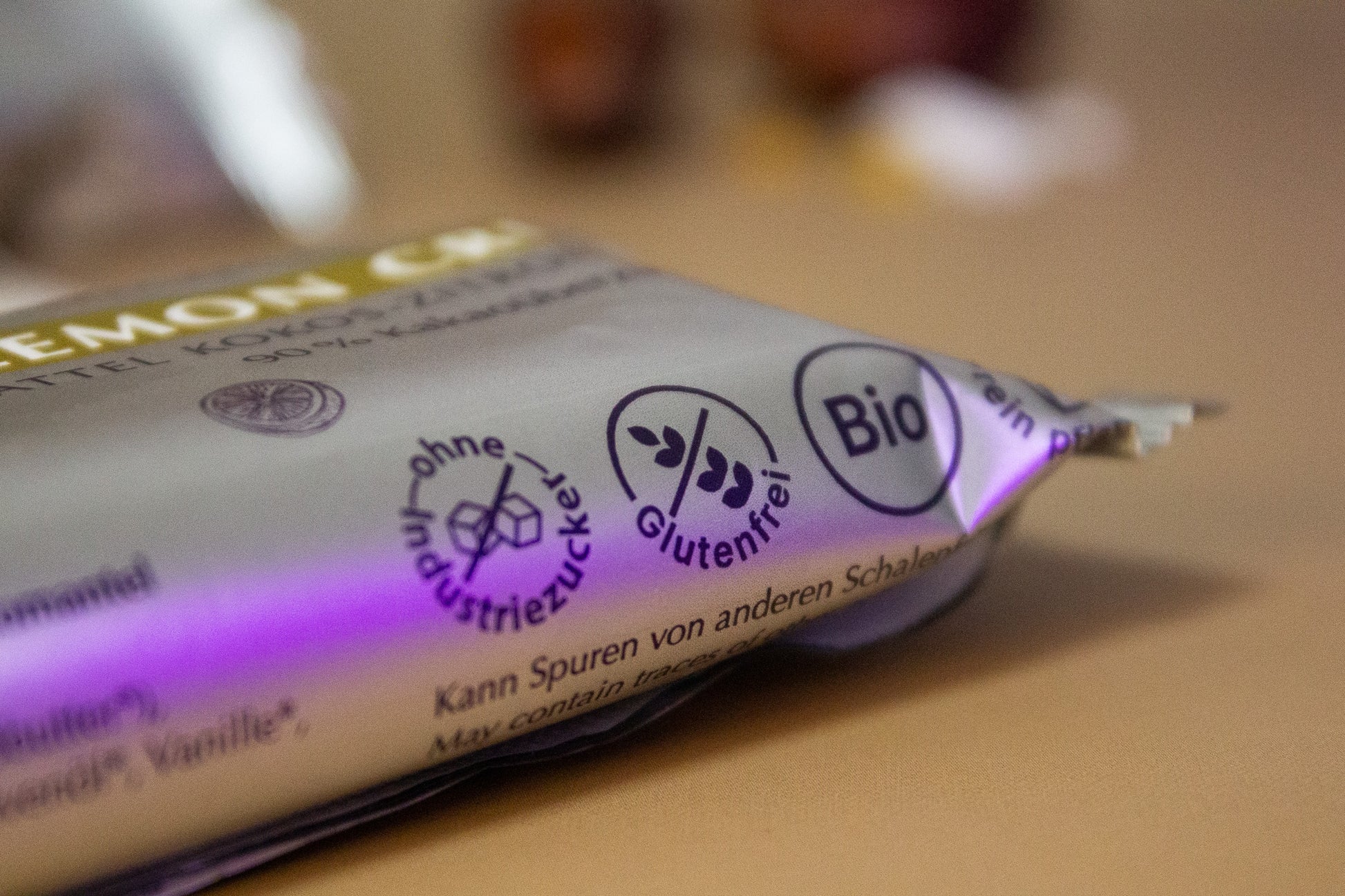 Bio Dattel-Kokosriegel mit Zitrone in 90 % Kakaomantel