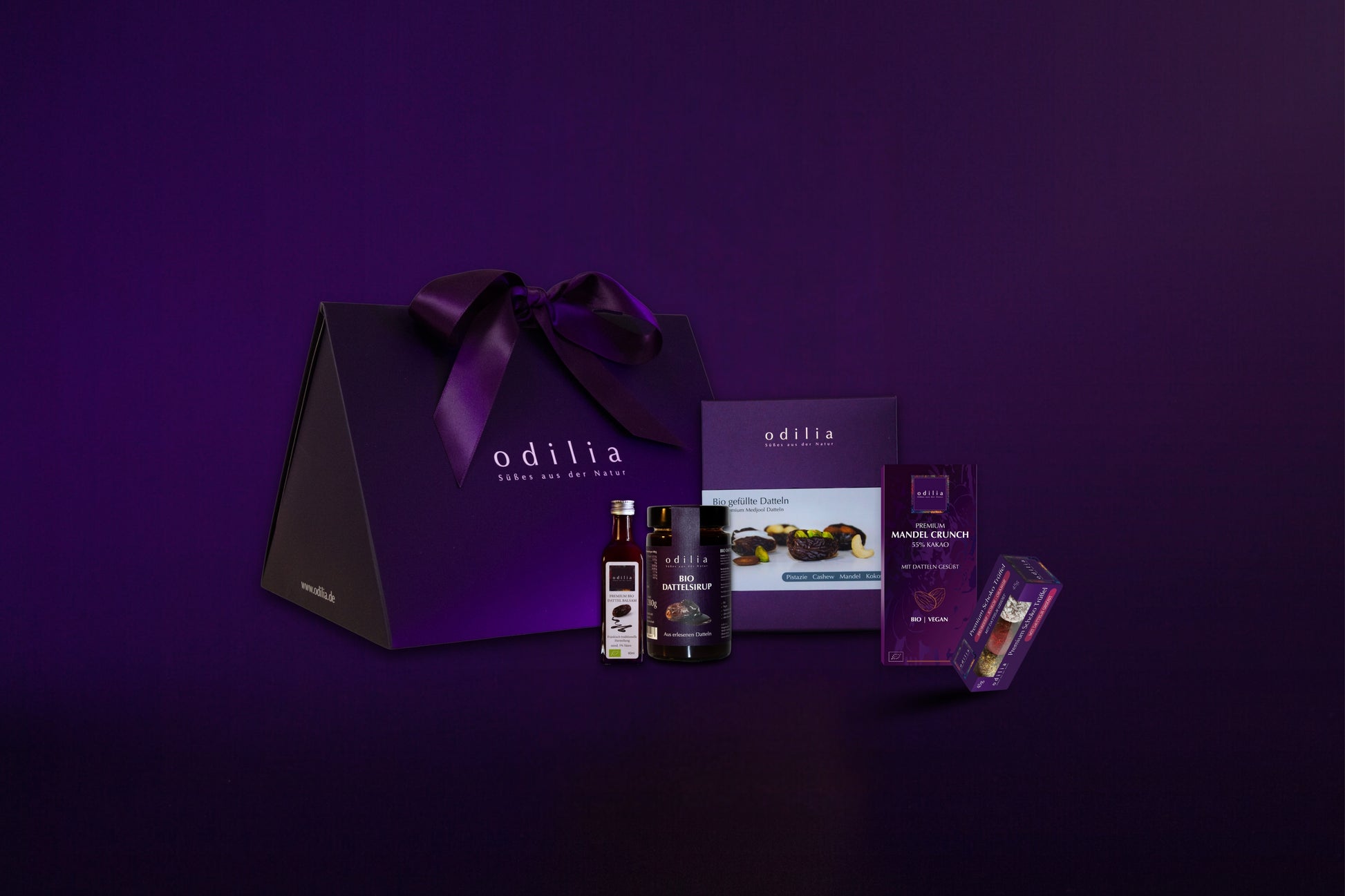 Ein festlicher Genussmoment in einer außergewöhnlichen Geschenkbox: saftig gefüllte Bio-Medjool-Datteln, knackige Mandel-Crunch-Schokolade, feiner Dattelsirup im Glas, edler Dattel-Balsamico und zarte Premium-Schoko-Trüffel.